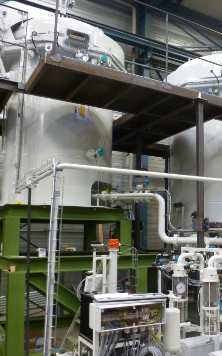 • Pulvérisation du fluide diélectrique en chambre de dégazage sous vide (quelques mbar) qui permet d’extraire humidité et gaz dissous rapidement : les micro-gouttelettes pulvérisées augmentent fortement la surface de contact avec le vide ambiant de la chambre de dégazage, favorisant l’extraction de l’humidité et des gaz